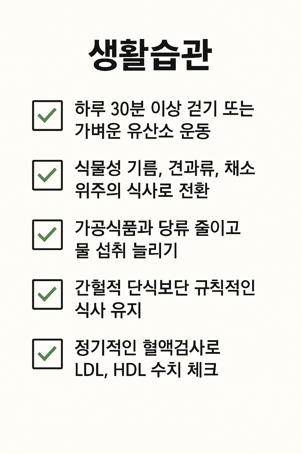 - 정기적인 혈액검사로 LDL, HDL 수치 체크