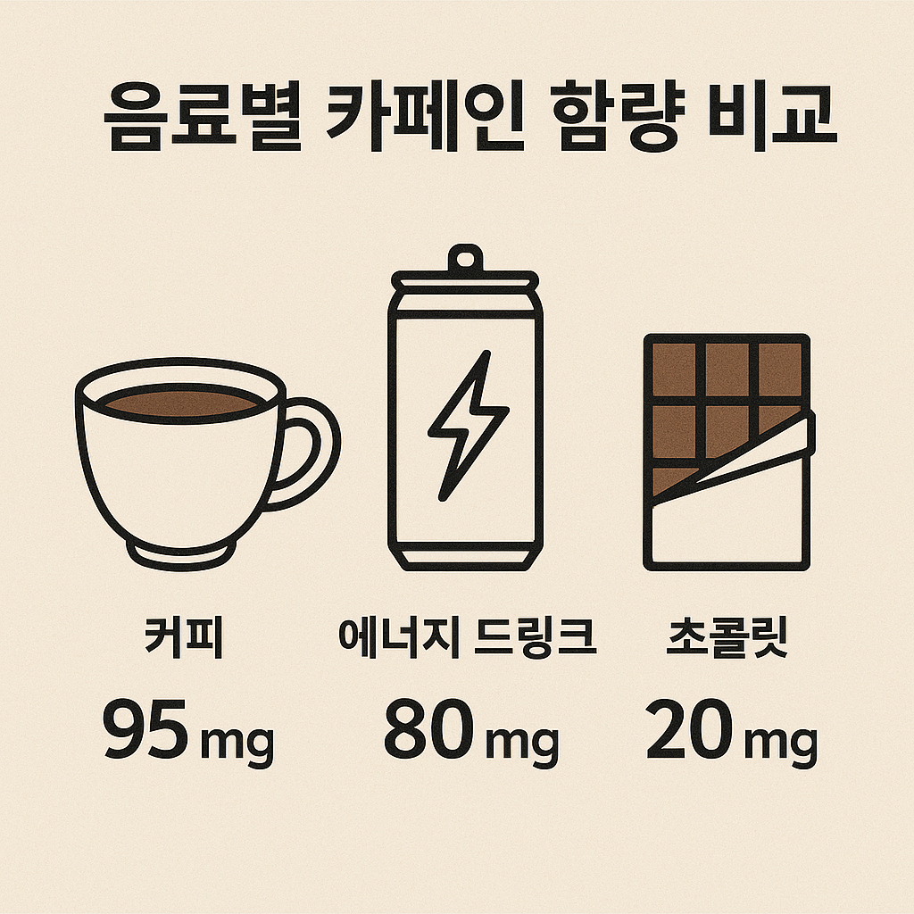 ‘음료별 카페인 함량 비교 인포그래픽’ (커피·에너지드링크·초콜릿)